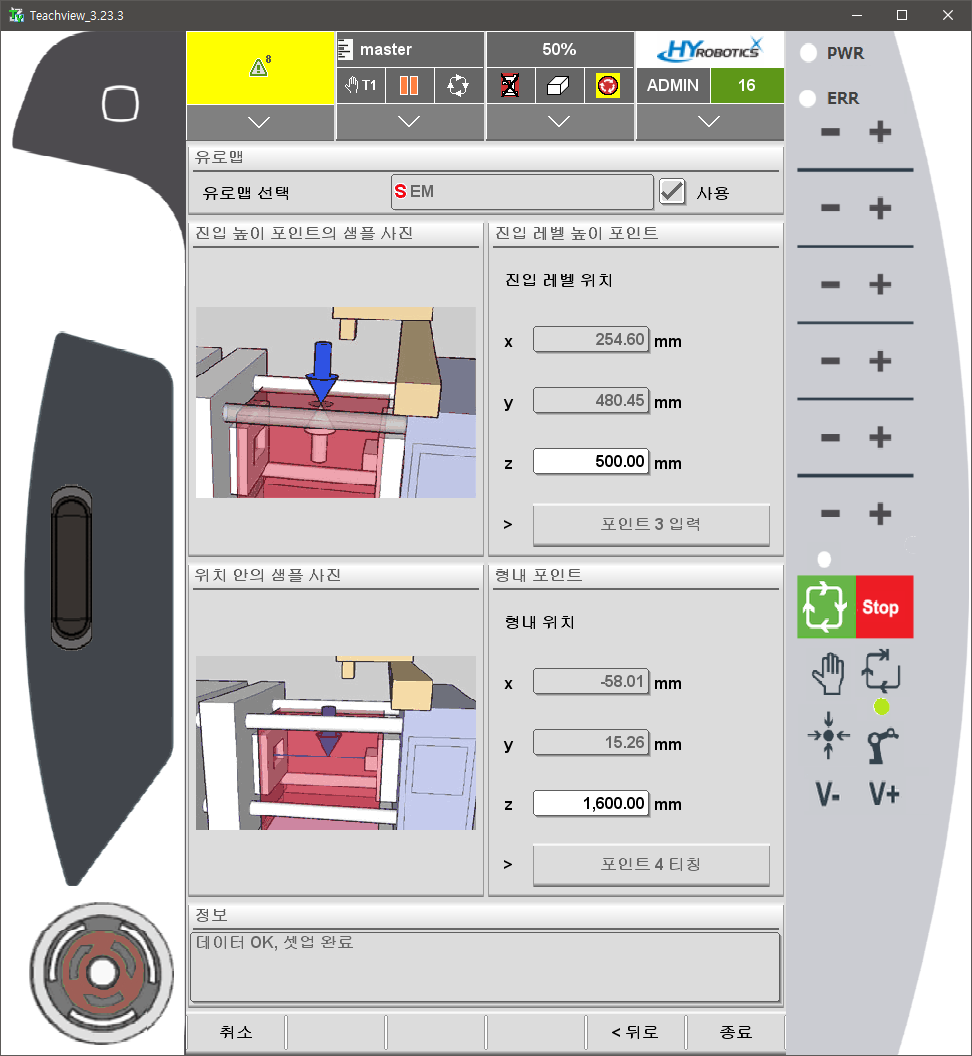에젝터 연동: 에젝터 전진 시 로봇암이 자동 후진하여 핀 보호